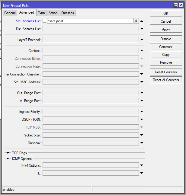 Dalam artikel kali ini saya akan menerangkan tentang add source to address list.pada dasarnya address list dapat memasukkan ip address mana saja yang dapat kita kelompokkan.pada address list kita dapat memasukkan ip address jika pc client menge ping router kita.kita juga dapat mengedit perintah apa saja yang dapat di gunakan seperti accept,drop,log reject dan lain-lain.tampa basa basi lagi ayo kita ngeLAB bareng .